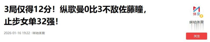 除了石洵瑶2-3惜败横井咲樱外,纵歌曼对阵佐藤瞳的比赛,更是以0-3的比分惨遭横扫,尽管纵歌曼也有亮眼表现,但整体实力的差距,还是让她难以撼动佐藤瞳的地位。