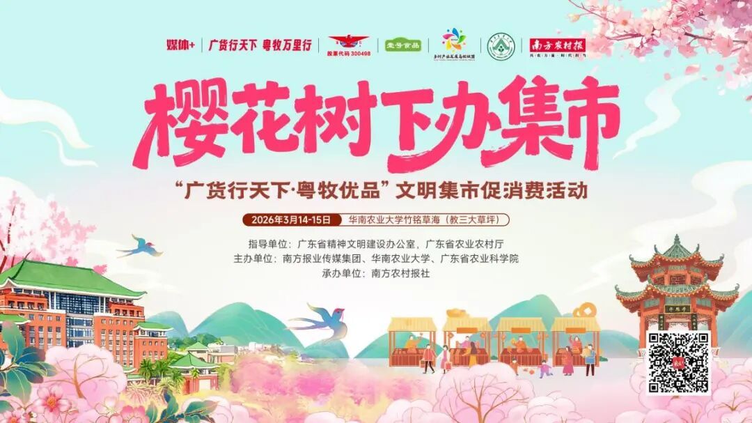 这份深耕产业的坚韧力量,化作惠民好物走进万家。3月14日至15日,“广货行天下·粤牧优品”文明集市促消费活动将在华南农业大学盛大启幕。该活动由广东省精神文明建设办公室、广东省农业农村厅联合指导,南方报业传媒集团、华南农业大学、广东省农业科学院主办,温氏股份、壹号食品、天农集团等企业特别支持,以“樱花树下办集市·粤牧优品惠万家”为主题,落地竹铭草海、第一教学楼、红满堂三大片区。邀您在春日踏青赏花的美好时光里,近距离品鉴粤牧优品,领略岭南畜牧文化的独特魅力,感受广东畜牧业的温柔与硬核。